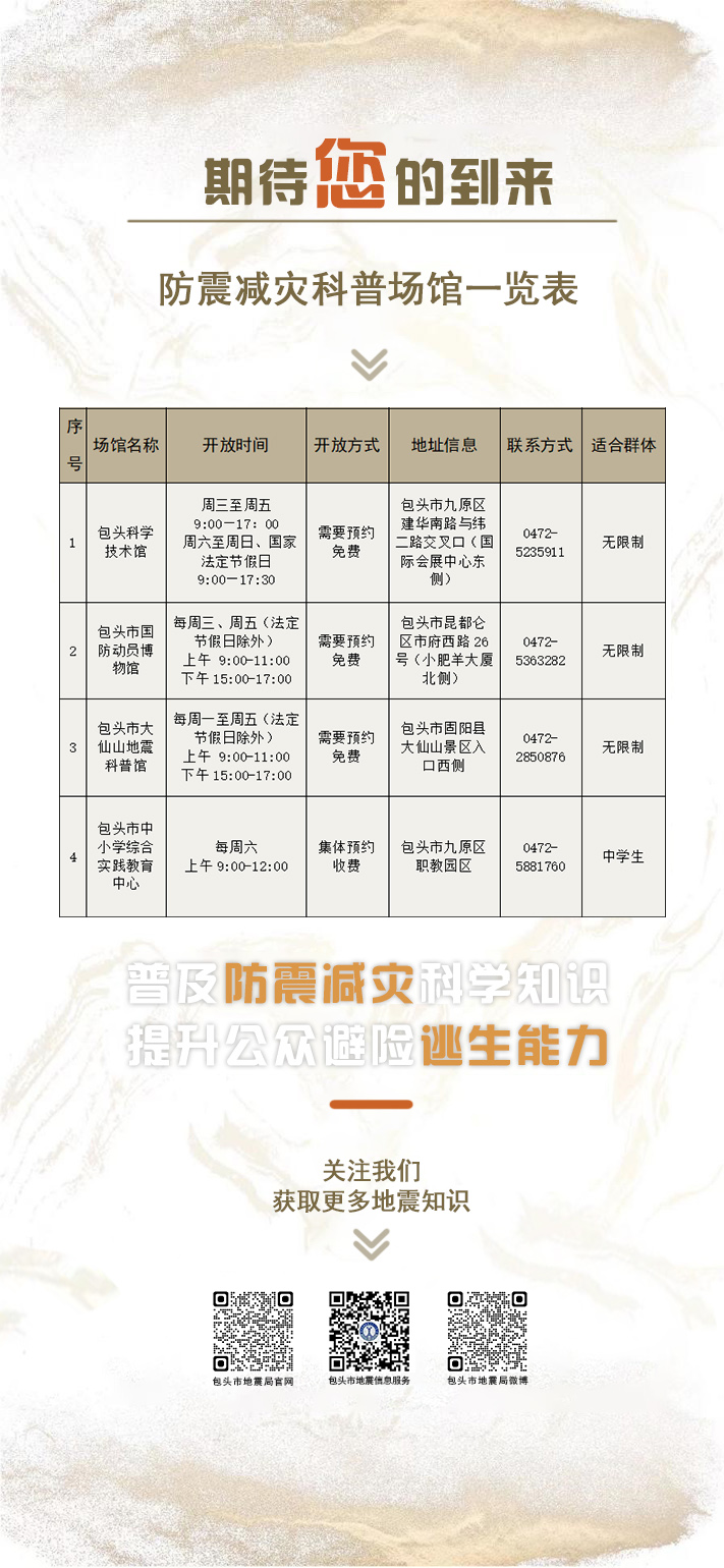 根据《关于做好内蒙古自治区2025年度防震减灾科普工作及公众防震避险能力建设相关工作的通知》要求和防震减灾科普场馆调查结果,现将2025年度包头市防震减灾科普场馆推介清单予以公布,欢迎社会公众预约参观。