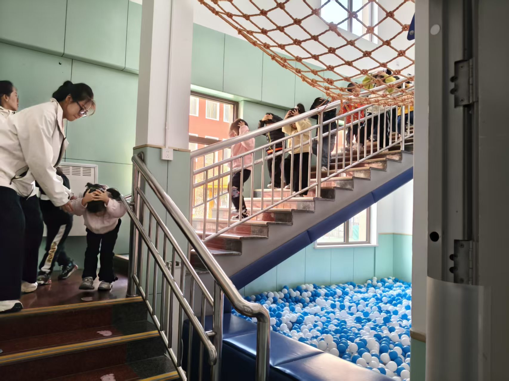 讲座结束后,随着警报声响起,实战演练环节正式开始。全园500余名师生迅速响应,在教师与地震局工作人员的指引下,严格按照避险要领,有序在教室进行紧急避险,随后沿预定疏散路线快速撤离至操场安全区域。整个演练过程组织严密、响应迅速、动作规范,有效检验了师生对所学知识的实际运用能力。